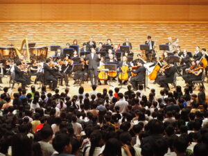 楽器の配置や演奏会のマナーなどを紹介する「オーケストラを楽しむためのガイドブック」も作成し、事前学習資料として各校へ配布。バスやフェリー、警備員も手配し、子どもたちが安全に移動出来るよう、細心の注意を払いながら開催しています。今後も、次世代を担う子どもたちの健全な育成のため継続して実施していきたいと考えています。市民の皆さまのご理解と温かい応援もよろしくお願いします!