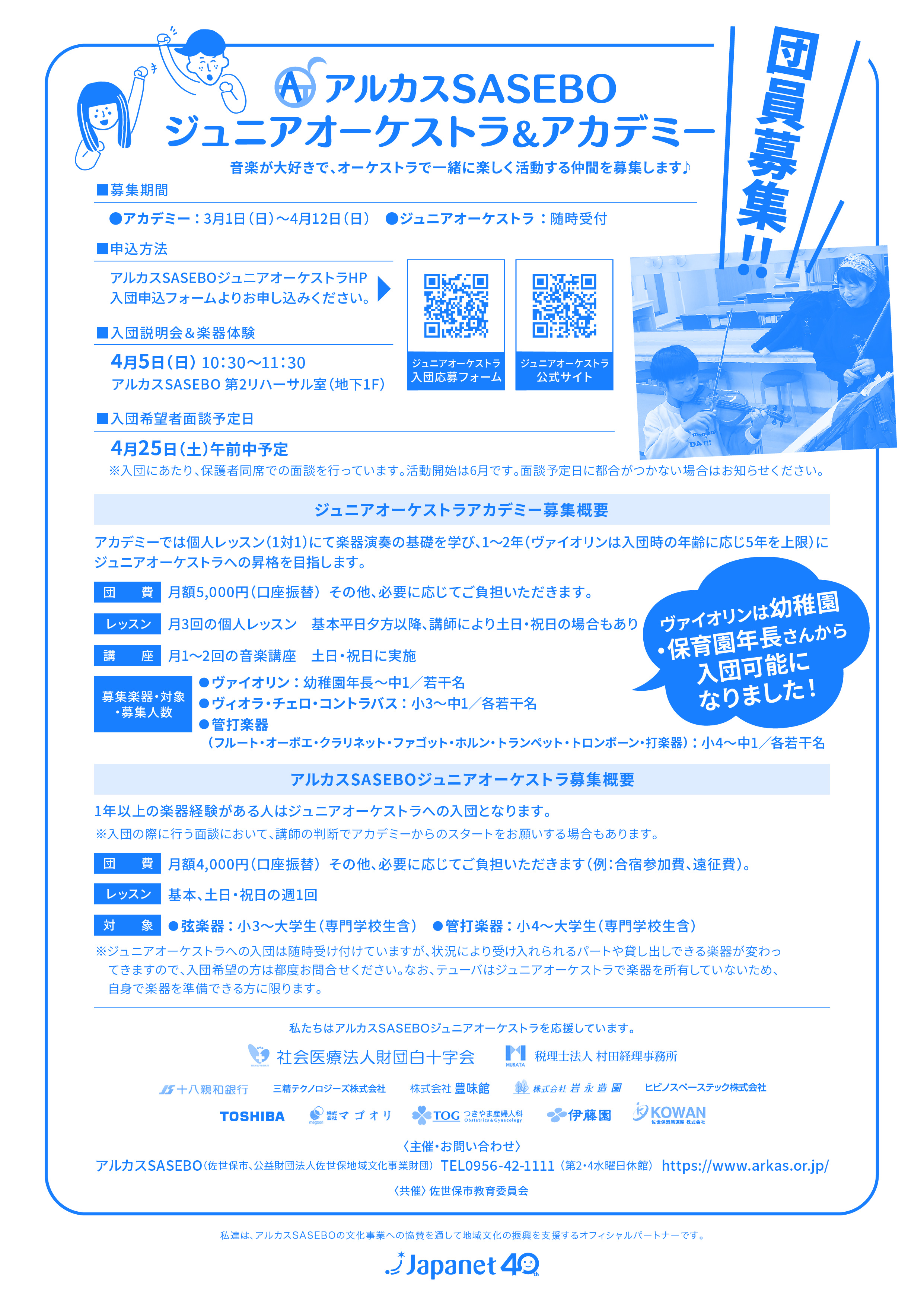 平成24年4月、これまで24年間続いてきた「佐世保市児童管弦楽団」を前身に、アルカスSASEBOを拠点に活動する「アルカスSASEBOジュニアオーケストラ」として発足。現在、佐世保市を中心とする小学3年生~大学生73名が在籍しており、長崎OMURA室内合奏団をはじめとする長崎県内外で活躍している演奏家が子どもたちの指導にあたっています。楽器を持つのは初めてだけど何より音楽が大好き、オーケストラで一緒に演奏したい!そんな子どもたちがアルカスSASEBOに集まっています!