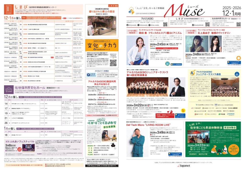 裏面には、佐世保市博物館島瀬美術センターで開催する催物情報や、佐世保市民文化ホールで開催する「第7回ふれあいフェスティバル」などの情報も掲載しております。日ごとに寒さが身にしみる時期となりましたが、アルカスSASEBOや島瀬美術センター、佐世保市民文化ホールの催しに足をお運びいただき、文化芸術で心温まる時間をお過ごしいただけましたら幸いです。