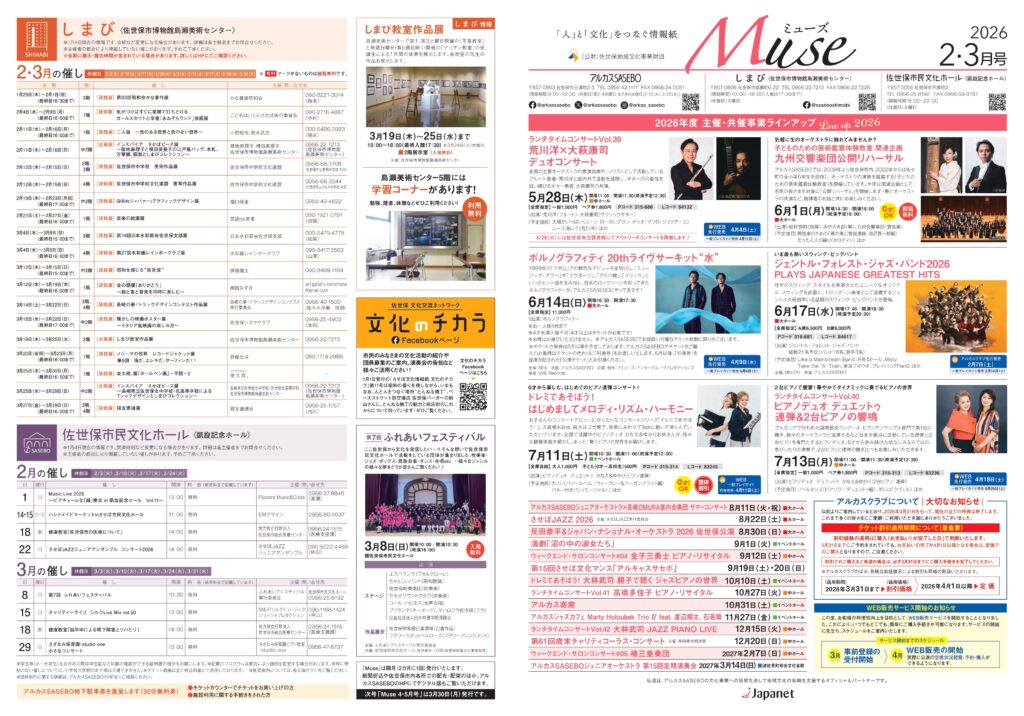 アルカスSASEBOや島瀬美術センター、佐世保市民文化ホールの催しに足をお運びいただき、文化芸術で心温まる時間をお過ごしいただけましたら幸いです。