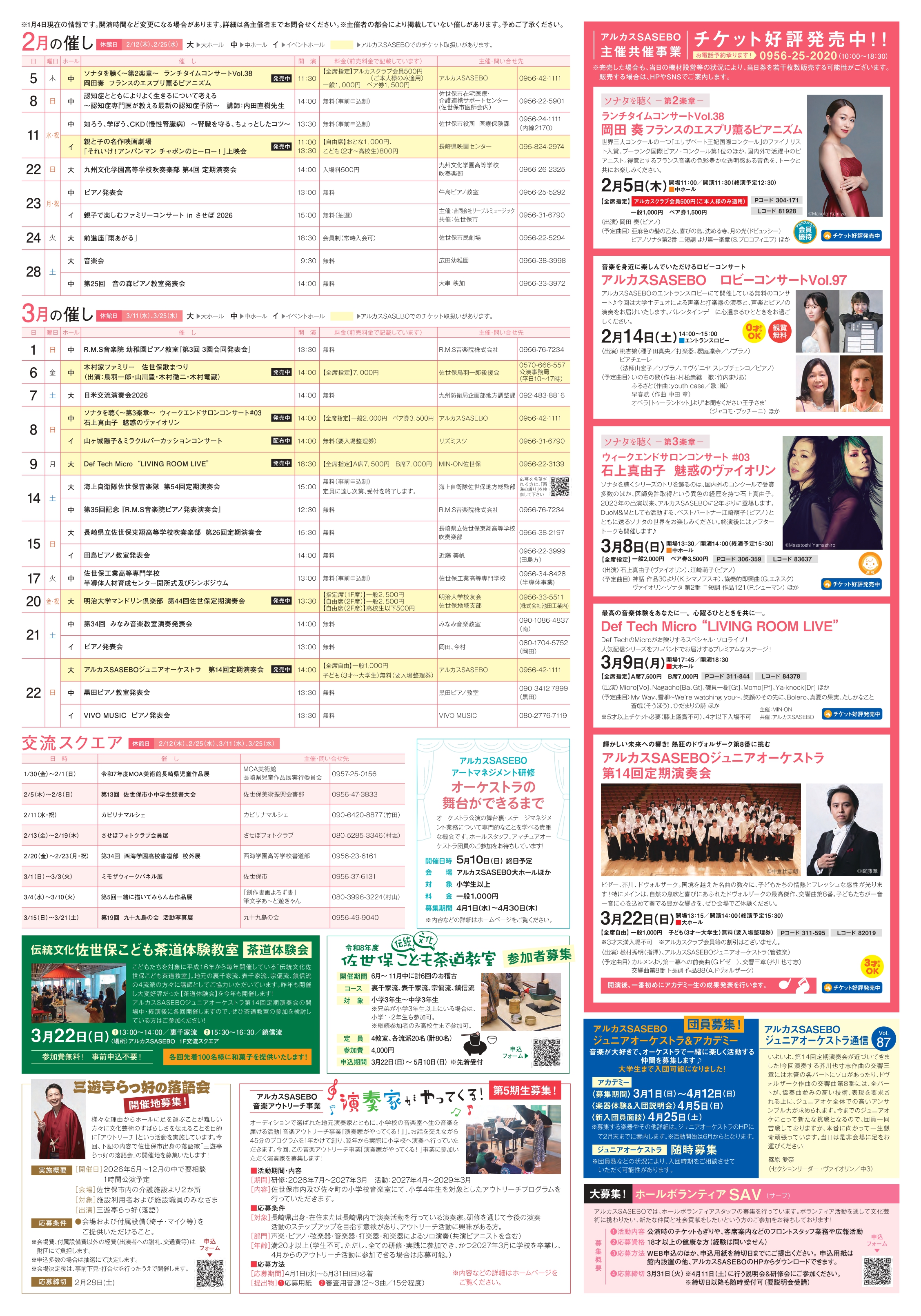 また、2月から3月にかけて開催する公演情報、ジュニアオーケストラの団員募集やこども茶道教室の参加者募集などの案内を掲載しております。