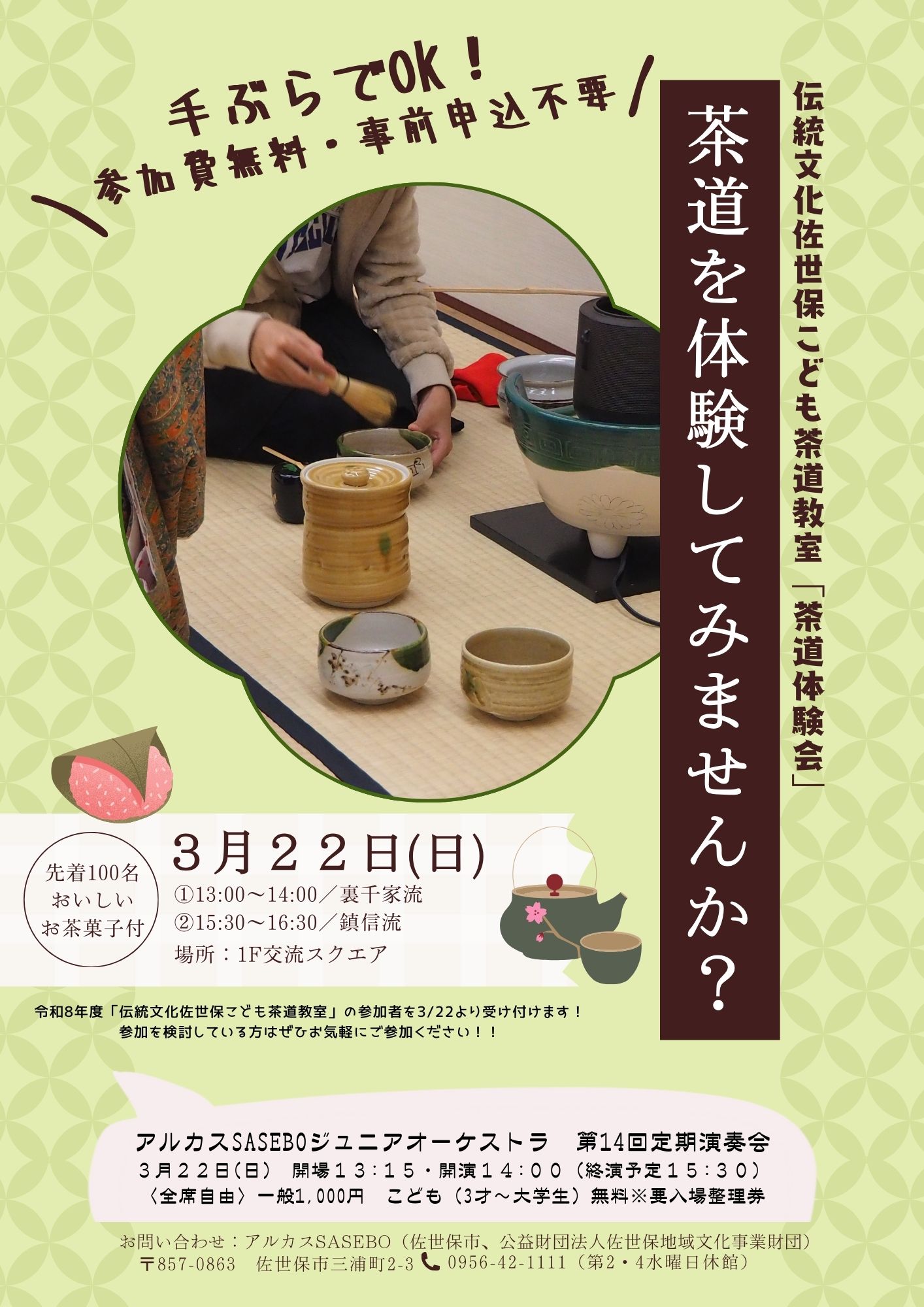 当日は、「アルカスSASEBOジュニアオーケストラ第14回定期演奏会」の開場中・終演後に各回開催いたしますので、ぜひこども茶道教室への参加をご検討されている方はご参加ください🎵