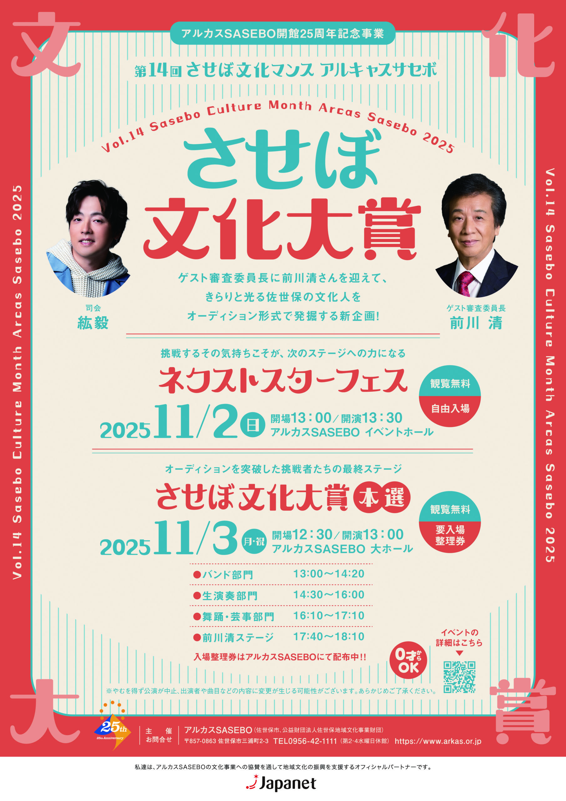 公演情報 座席表 過去の事業 主催・共催事業 その他の取扱チケット 2025年10月 11月 12月 2026年1月 2月 3月 4月 5月 6月 7月 8月 9月 2025年10月 9 月23日(火)開演 15:0010 月18日(土)開演 13:0011 月8日(土)開演 13:30 ながさきピースミュージックラリー2025 2025年11月 11 月1日(土)開場 12:00開演 13:00 させぼJAZZ 2025 11 月2日(日)開場 13:00開演 13:3011 月3日(月)開場 12:30開演 13:00 第14回させぼ文化マンス アルキャスサセボ『させぼ文化大賞』 9 月23日(火)開演 15:0010 月18日(土)開演 13:0011 月8日(土)開演 13:30 ながさきピースミュージックラリー2025 11 月15日(土)開場 12:15開演 13:00 ~長崎から世界へ響く平和のハーモニー~ バッハ・コレギウム・ジャパン「メサイア」公演 11 月16日(日)開場 16:00開演 17:00 さだまさしコンサートツアー2025 生命の樹~Tree of Life~ 11 月28日(金)開場 19:00開演 19:00 アルカスSASEBOロビーコンサートVol.96 2025年12月 12 月5日(金)開場 17:45開演 18:30 ジェイコブ・コーラー ピアノコンサート 12 月13日(土)開場 10:30開演 11:00 ドレミであそぼう!0才からのクラシック ~たのしいピアノコンサート~ 12 月16日(火)開場 11:00開演 11:30 ソナタを聴く~第1楽章~ ランチタイムコンサートVol.37 中川賢一とピアノ・ソナタの世界 2026年2月 2 月5日(木)開場 11:00開演 11:30 ~ソナタを聴く 第2楽章~ ランチタイムコンサートVol.38 岡田奏 フランスのエスプリ薫るピアニズム 2026年3月 3 月8日(日)開場 13:30開演 14:00 ソナタを聴く第3楽章 ウィークエンドサロンコンサート#03 石上真由子 魅惑のヴァイオリン