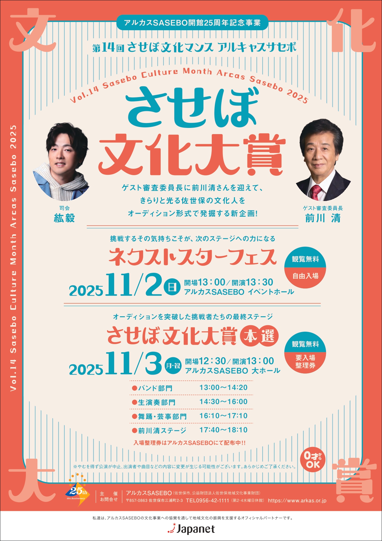 公演情報 座席表 過去の事業 主催・共催事業 その他の取扱チケット 2025年10月 11月 12月 2026年1月 2月 3月 4月 5月 6月 7月 8月 9月 2025年10月 10 月10日(金)開場 18:00開演 18:30 キーウ・クラシック・バレエ 白鳥の湖ー全2幕ー 9 月23日(火)開演 15:0010 月18日(土)開演 13:0011 月8日(土)開演 13:30 ながさきピースミュージックラリー2025 2025年11月 11 月1日(土)開場 12:00開演 13:00 させぼJAZZ 2025 11 月2日(日)開場 13:00開演 13:3011 月3日(月)開場 12:30開演 13:00 第14回させぼ文化マンス アルキャスサセボ『させぼ文化大賞』 9 月23日(火)開演 15:0010 月18日(土)開演 13:0011 月8日(土)開演 13:30 ながさきピースミュージックラリー2025 11 月15日(土)開場 12:15開演 13:00 ~長崎から世界へ響く平和のハーモニー~ バッハ・コレギウム・ジャパン「メサイア」公演 11 月16日(日)開場 16:00開演 17:00 さだまさしコンサートツアー2025 生命の樹~Tree of Life~ 11 月28日(金)開場 19:00開演 19:00 アルカスSASEBOロビーコンサートVol.96 2025年12月 12 月5日(金)開場 17:45開演 18:30 ジェイコブ・コーラー ピアノコンサート 12 月13日(土)開場 10:30開演 11:00 ドレミであそぼう!0才からのクラシック ~たのしいピアノコンサート~ 12 月16日(火)開場 11:00開演 11:30 ソナタを聴く~第1楽章~ ランチタイムコンサートVol.37 中川賢一とピアノ・ソナタの世界 2026年2月 2 月5日(木)開場 11:00開演 11:30 ~ソナタを聴く 第2楽章~ ランチタイムコンサートVol.38 岡田奏 フランスのエスプリ薫るピアニズム 2026年3月 3 月8日(日)開場 13:30開演 14:00 ソナタを聴く第3楽章 ウィークエンドサロンコンサート#03 石上真由子 魅惑のヴァイオリン