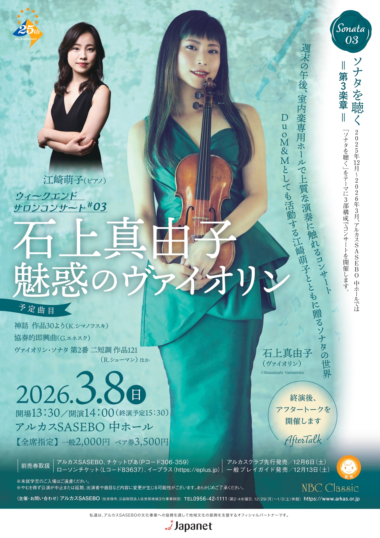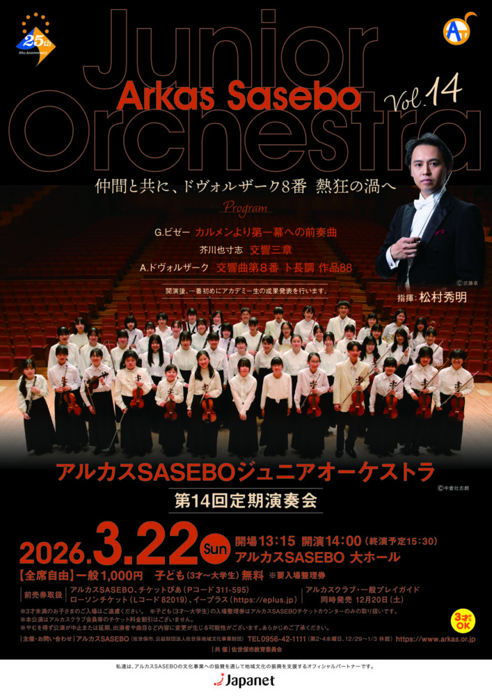 公演情報 座席表 過去の事業 主催・共催事業 その他の取扱チケット 2025年12月 2026年1月 2月 3月 4月 5月 6月 7月 8月 9月 10月 11月 2025年12月 12 月13日(土)開場 10:30開演 11:00 ドレミであそぼう!0才からのクラシック ~たのしいピアノコンサート~ 12 月14日(日)開場 13:30開演 14:0012 月15日(月)開場 10:30開演 11:00 聴き方が変わる!ソナタを「読み解く」コンサート 12 月16日(火)開場 11:00開演 11:30 ソナタを聴く~第1楽章~ ランチタイムコンサートVol.37 中川賢一とピアノ・ソナタの世界 12 月21日(日)開場 12:00開演 12:30 第60回 歳末チャリティコーラス・コンサート 2026年2月 2 月5日(木)開場 11:00開演 11:30 ~ソナタを聴く 第2楽章~ ランチタイムコンサートVol.38 岡田奏 フランスのエスプリ薫るピアニズム 2 月14日(土)開演 14:00 アルカスSASEBOロビーコンサートVol.97 2026年3月 3 月8日(日)開場 13:30開演 14:00 ソナタを聴く第3楽章 ウィークエンドサロンコンサート#03 石上真由子 魅惑のヴァイオリン 3 月9日(月)開場 17:45開演 18:30 Def Tech Micro ”LIVING ROOM LIVE” Season2 3 月22日(日)開場 13:15開演 14:00 アルカスSASEBOジュニアオーケストラ第14回定期演奏会